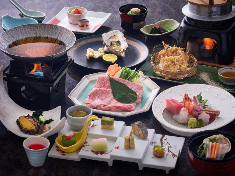 Apéritif Seasonal sake Appetizer: Assortment of seven seasonal dishes Soup: Clam and spring vegetable soup Sashimi: Today's delicious fish Small pot Hiroshima beef Sakura hotpot Grilled dish: Wakasa-yaki conger eel and oysters Deep-fried Sakura shrimp tempura Vinegared Steamed Abalone Meal: Clam rice pot Assortment of three pickles Tomewan Red Miso Soup Two seasonal dishes