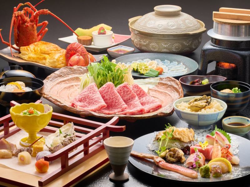 這是鮑魚、龍蝦、廣島牛一起享用的懷石料理。